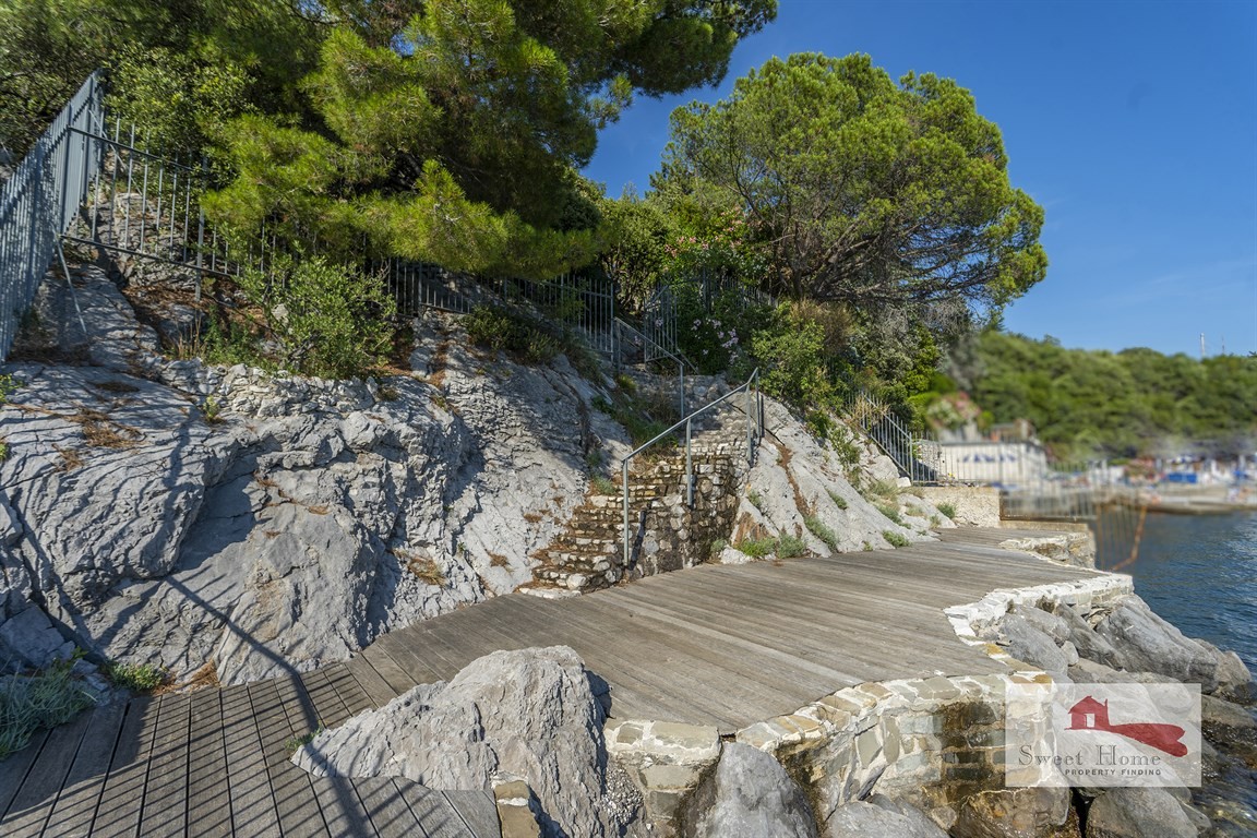 Lungo la costiera triestina, prestigiosa e irripetibile villa singola con piscina a sfioro vista golfo e giardino degradante verso la discesa a mare privata.