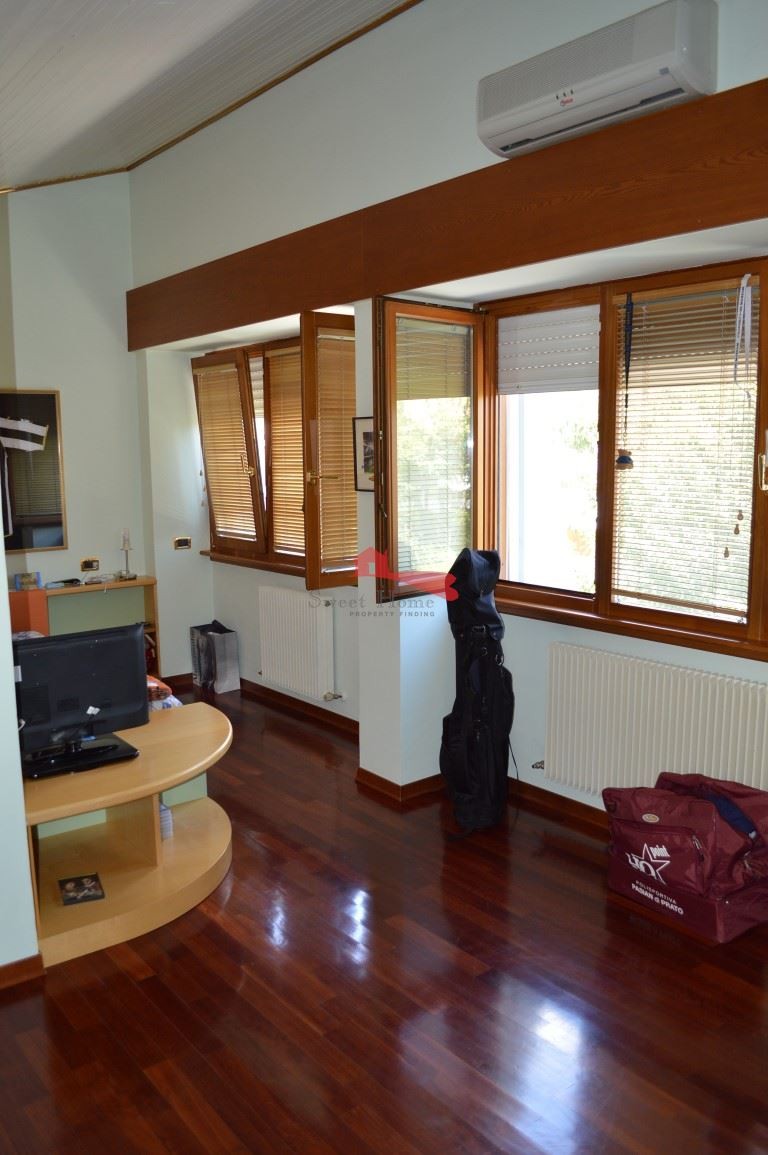 Una bella scala in legno conduce al primo piano, dove si trova la zona notte con un soppalco affacciato sul salotto e tre grandi camere di cui la matrimoniale con bagno e cabina armadio e le altre due camere con altre 3 cabine armadio e 1 bagno.