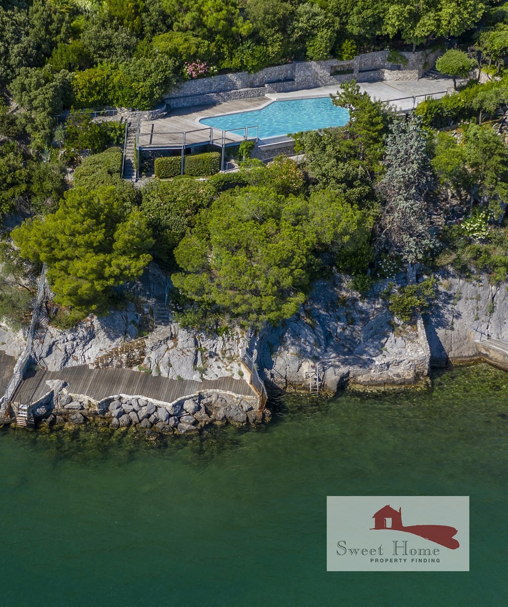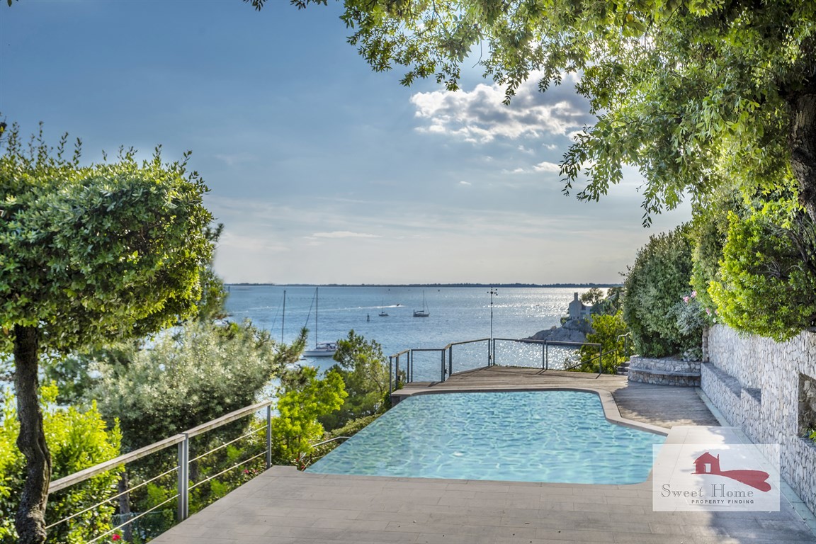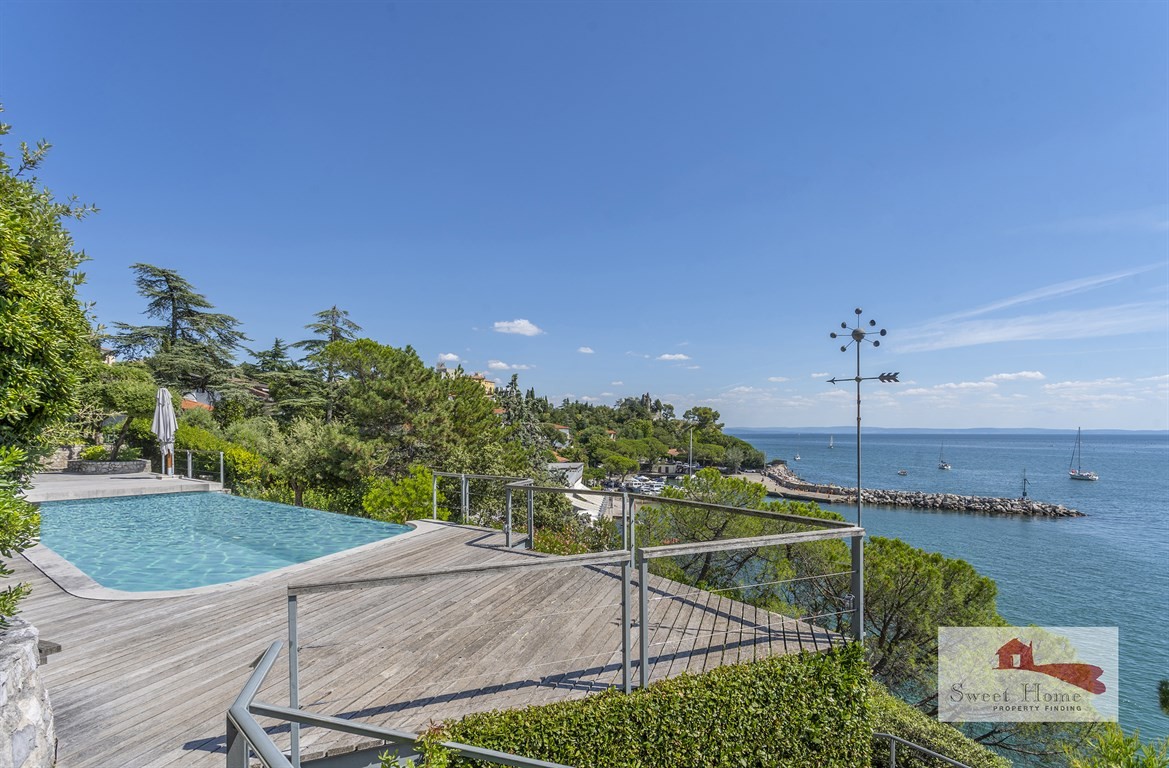 Lungo la costiera triestina, prestigiosa e irripetibile villa singola con piscina a sfioro vista golfo e giardino degradante verso la discesa a mare privata.